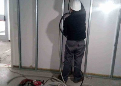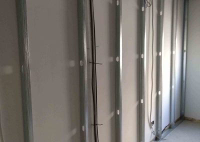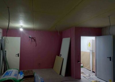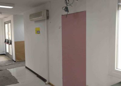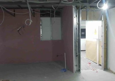 La tabiquería compuesta por perfilería especial, formada por una placa yeso laminado para exterior archivo y tres palcas PPF 15 mm, para interior archivo, para conseguir un RF de 120 minutos. Los falsos techos suspendidos Placo Fire, formado por dos placas de 25 mm y estructura aportante F-530. Se realiza protección al fuego del suelo por debajo del forjado. El suelo se realiza de linóleo de 3,2 mm.